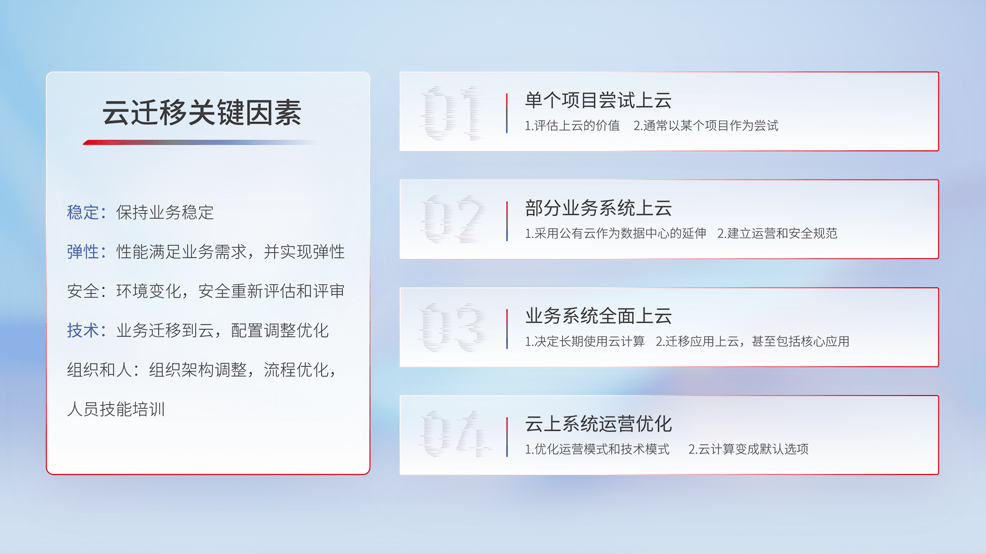 结合实际业务,,从规划设计、、、云平台选型、、云原生改造、、、数据迁移、、、集成交付,,,,迁移全过程为客户识别最佳上云路径,,,,做好风险识别管理,,设计网络架构、、身份权限、、、、安全审计合规、、、、操作审计、、、、日志审计、、、监控告警策略、、、多站点容灾设计等,,,,对云上基础设施进行整体规划,,,,提升IT治理水平,,以满足弹性、、、高可用、、、高性能的需求。。。。