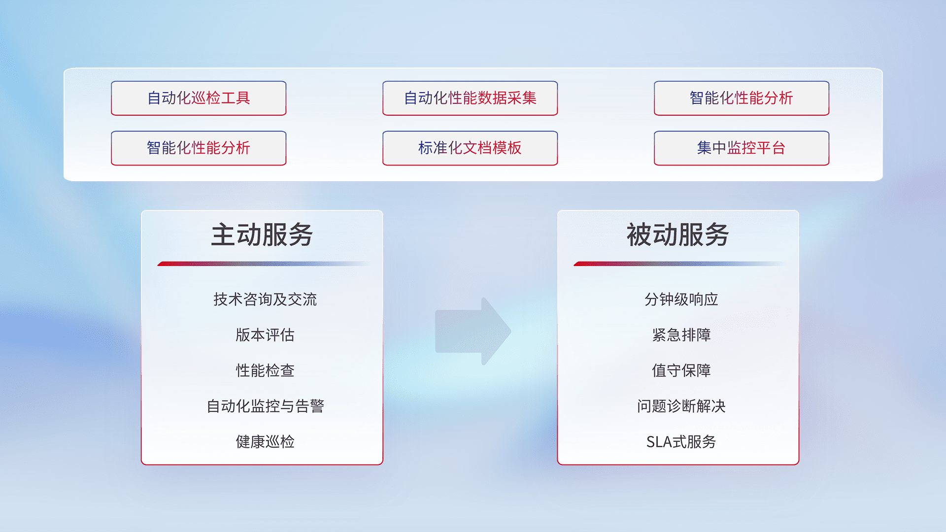 智能化工具和标准化文档,,,,保障服务质量,,,提供主动服务(包含技术咨询、、版本评估、、、、性能检查、、、、自动化监控与告警、、、健康巡检)和被动服务包含(分钟级响应、、紧急排障、、、值守保障、、、问题诊断解决、、、SLA服务)。。。